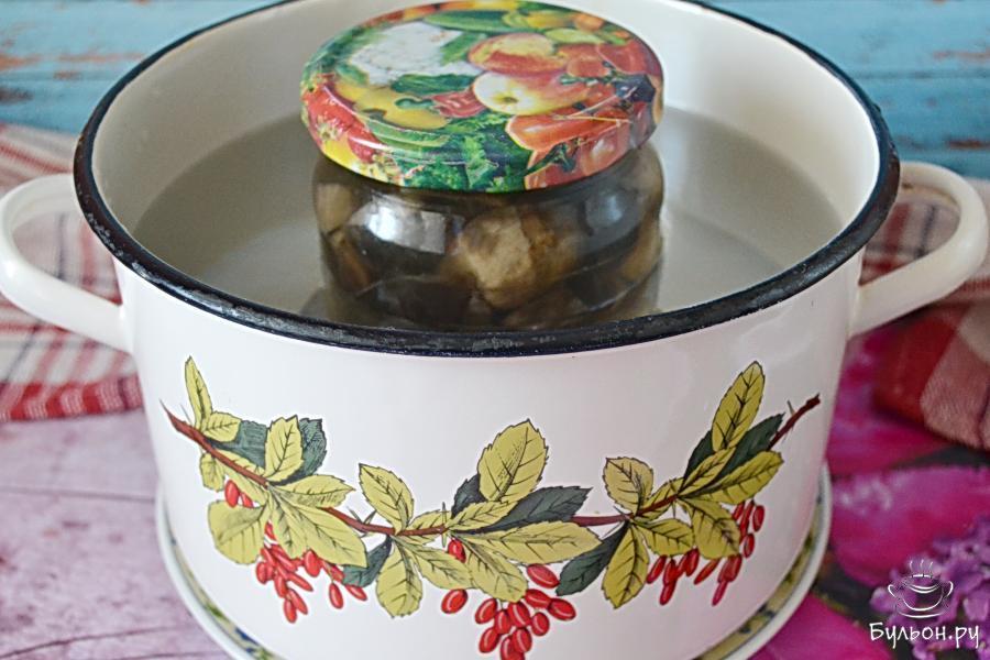 10. Кастрюлю наполнить водой, поставить вниз подставку для банки, поставить на подставку банку, прикрытую крышкой, и простерилизовать грибы на водяной бане еще 12 минут (от того момента, когда закипит вода).