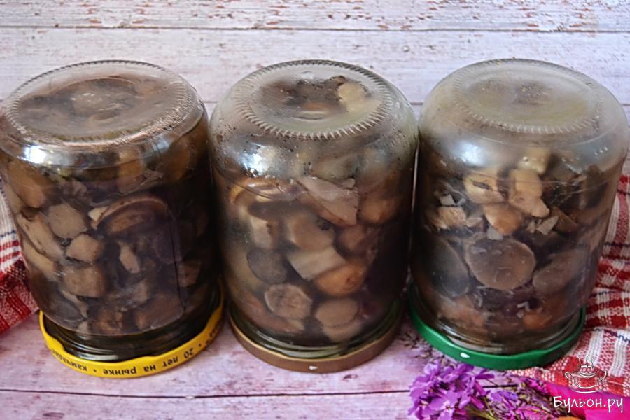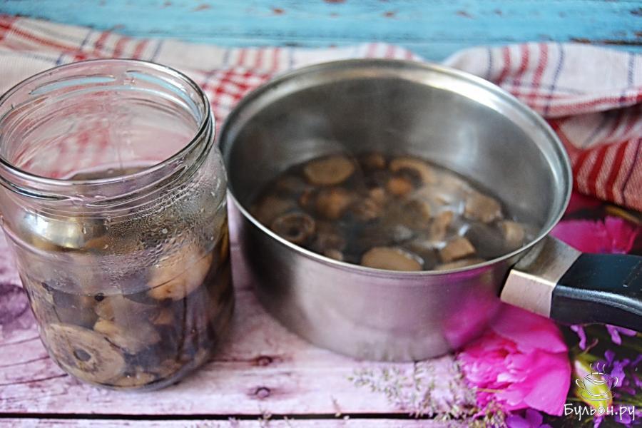 9. Грибы разложить по баночкам. Заполнить банку грибами вместе с маринадом так, чтобы грибы находились в жидкости.