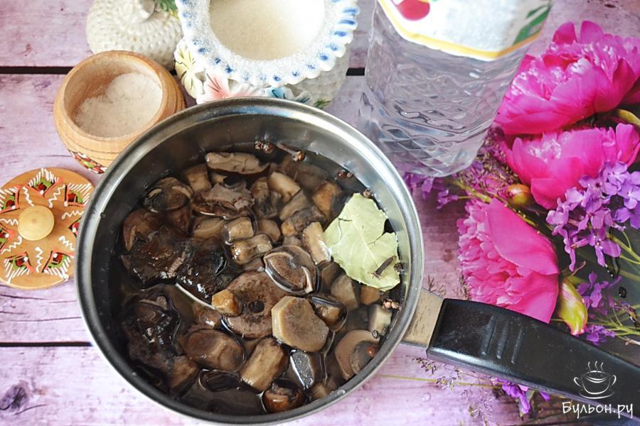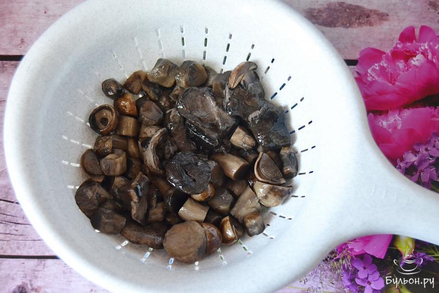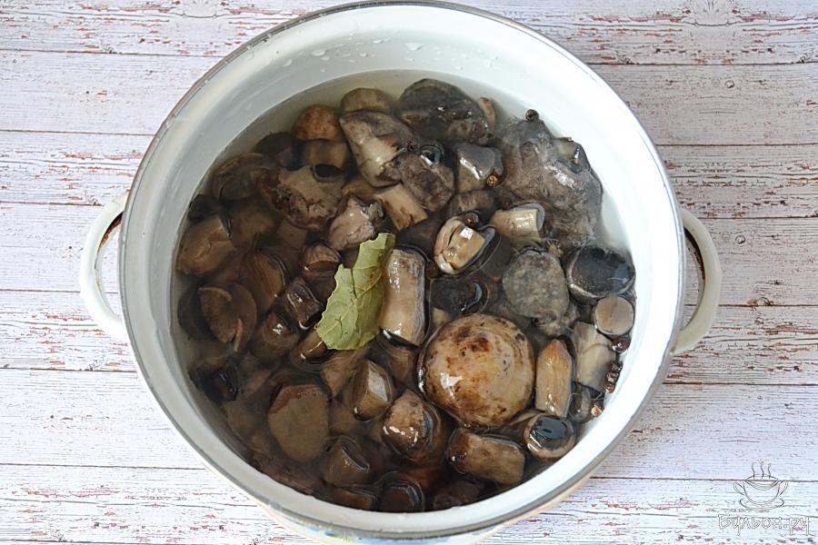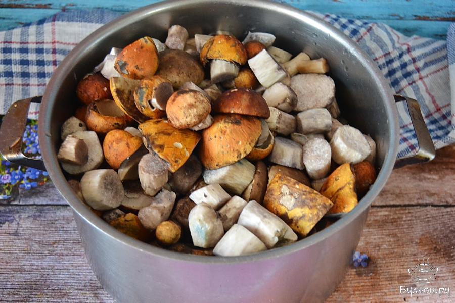 2. Нарезать грибы кусочками, сложить в кастрюлю и хорошо промыть несколько раз в новой воде. Варить грибы час в посоленной воде.