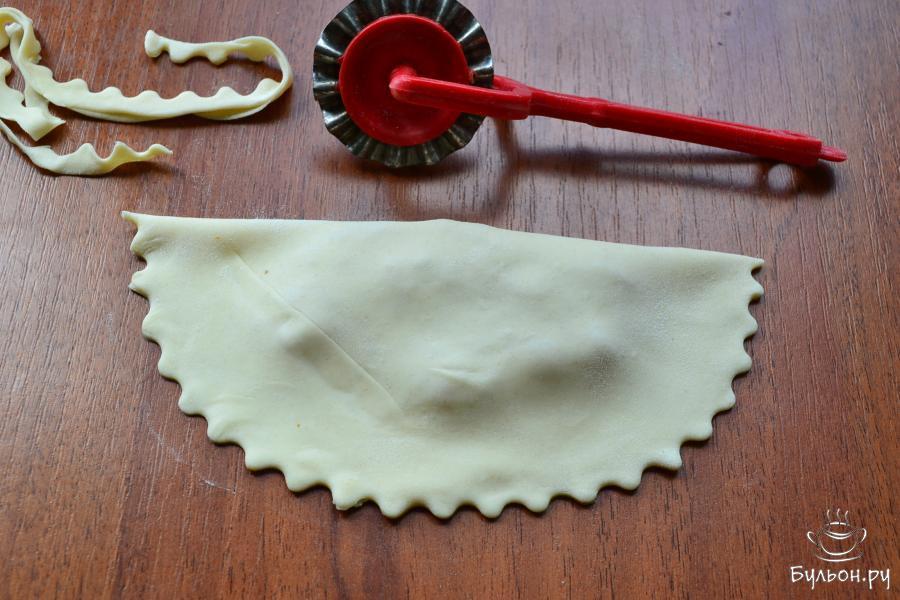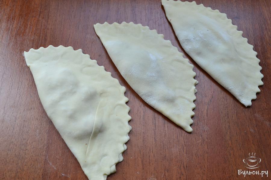 13. Формировать нужно по 3-4 чебурека и сразу же их жарить. Если вы слепите все чебуреки, тесто из-за жидкого фарша может размякнуть и порваться.