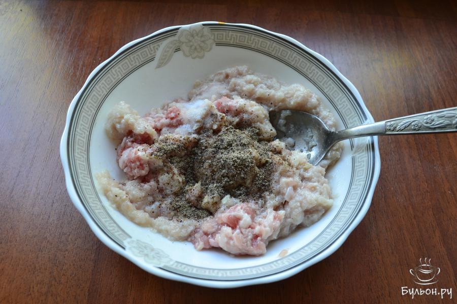 9. Смешать лук с фаршем, добавить 0,5 ч. Ложки соли или по вкусу, а также, щедро всыпать черный перец.