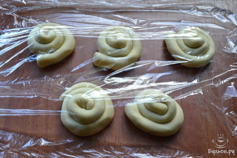 7. А затем, каждый жгутик свернуть спиралью. Накрыть "спиральки" пищевой пленкой и оставить на пол часа.