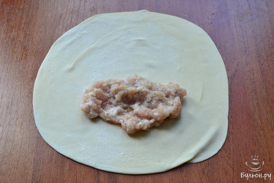 11. Каждую свернутую "спиральку" из теста раскатать в тоненькую лепешку, выложить 1-2 ст. Ложки фарша.