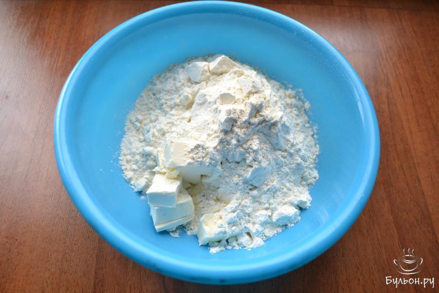 1. 100 г холодного сливочного масла (можно заменить качественным маргарином) порезать кубиками в миску, всыпать муку.