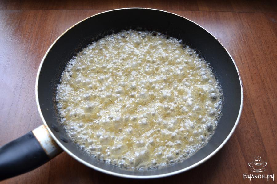 5. Поставить сковороду на небольшой огонь и выдержать минут 5-6, сироп станет светло-карамельного цвета.