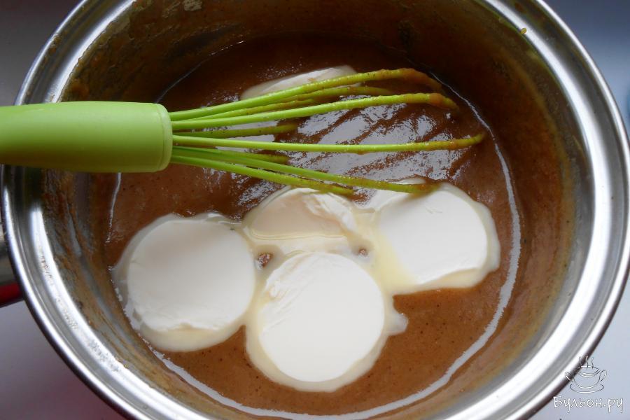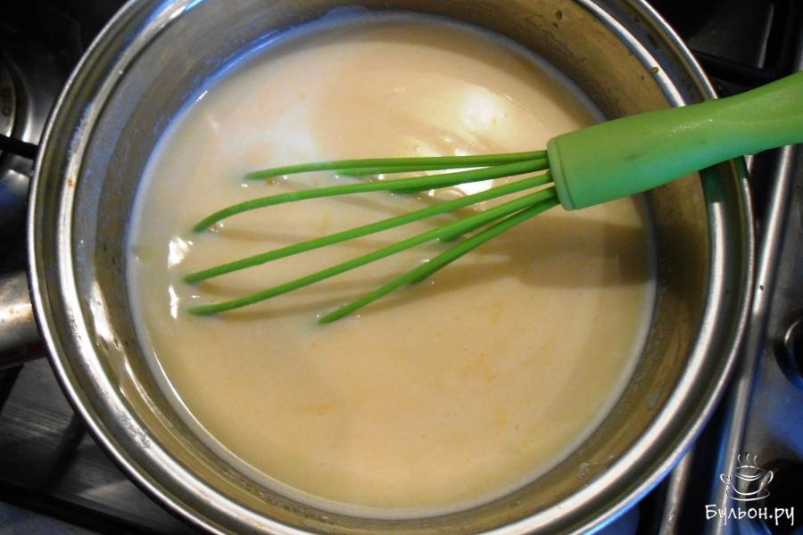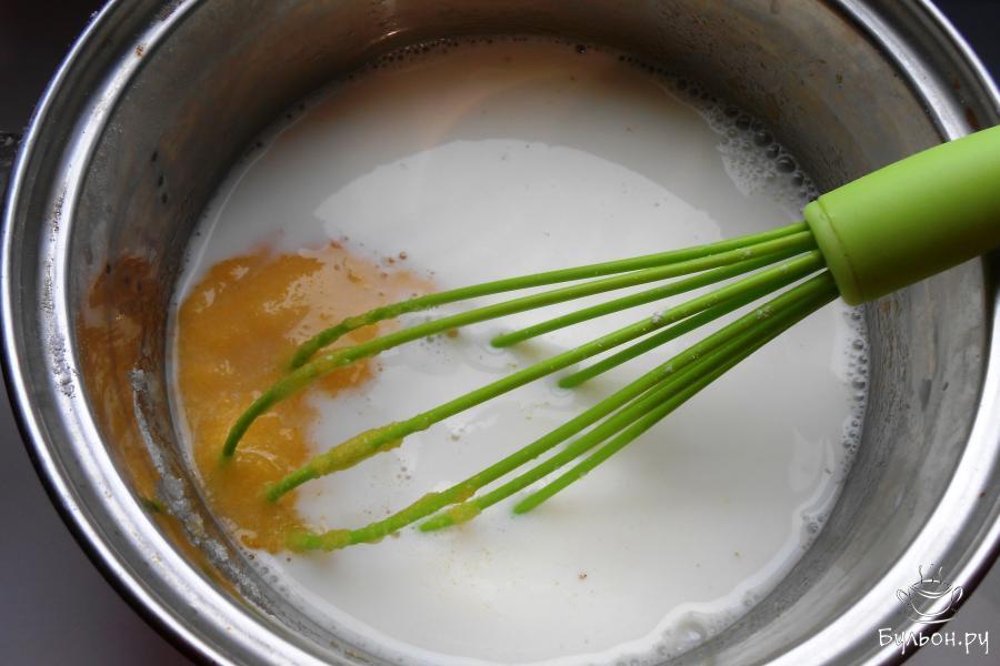 10. Делаем крем. Для этого соединяем венчиком одно куриное яйцо с сахаром, ванилином и тремя столовыми ложками муки.