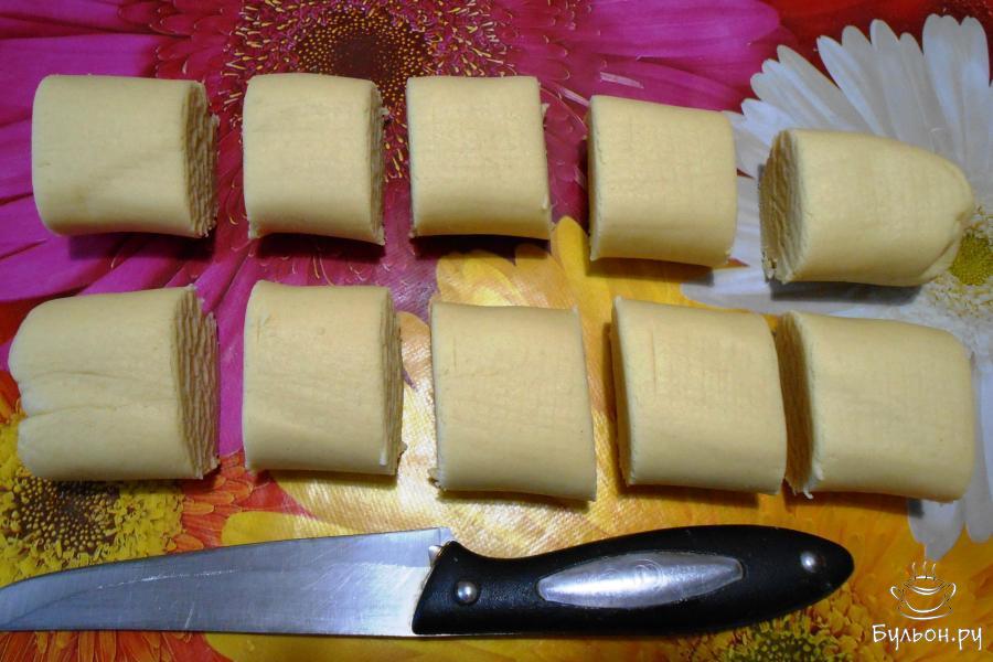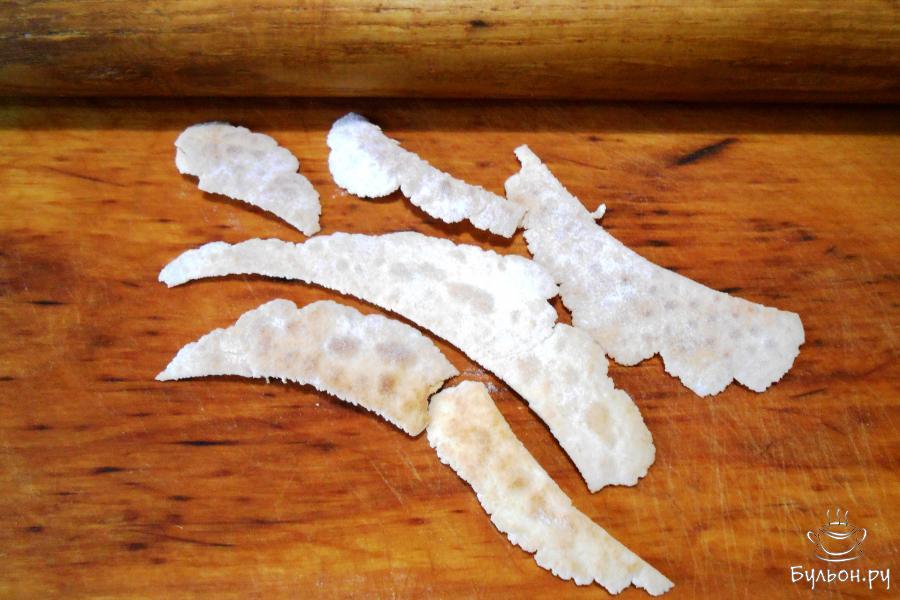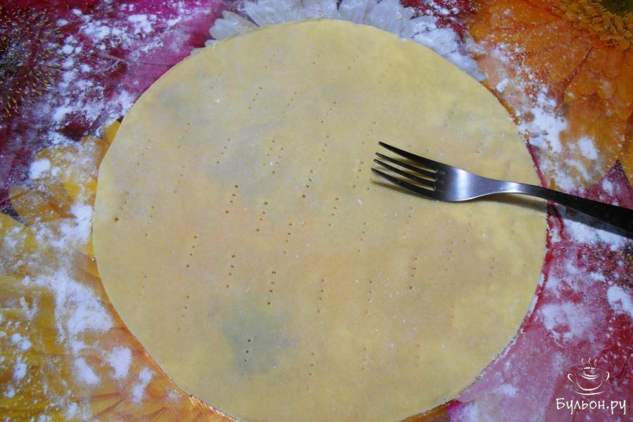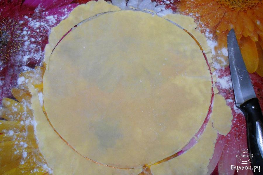 5. Раскатываем кусочек теста скалкой, стараемся сделать круг. С помощью тарелки вырезаем ровный круг.