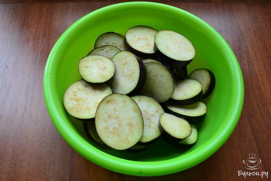 1. Баклажаны нужно порезать кружками, толщина которых должна составлять около 1 см, посыпать солью и дать постоять им 20 мин.