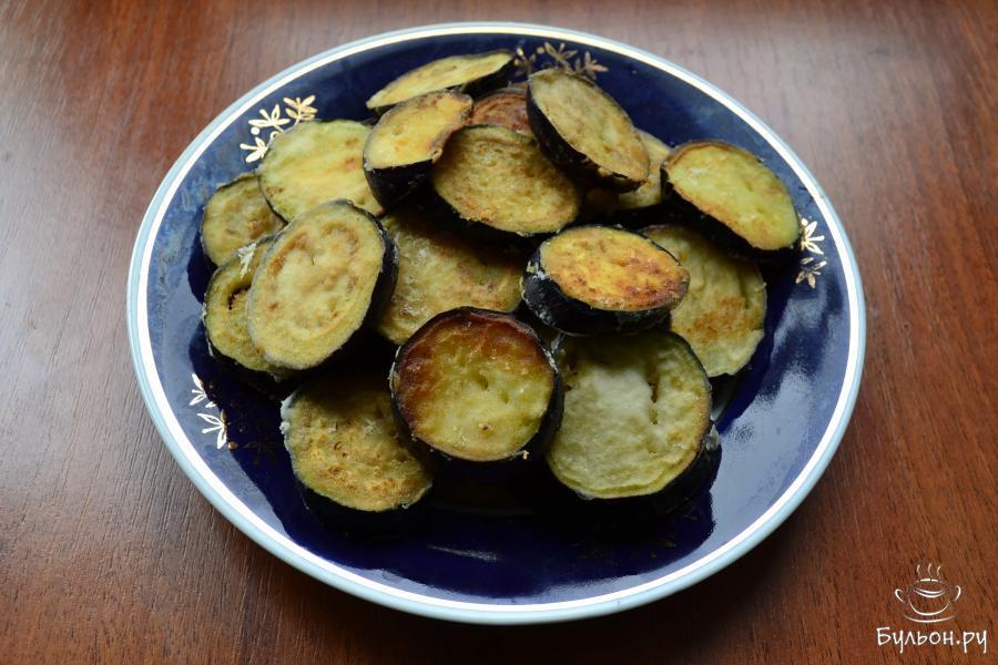 3. Кружки баклажанов обжарить на любом масле растительного происхождения до готовности, обсушить бумажным полотенцем.