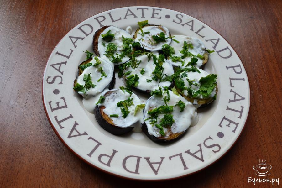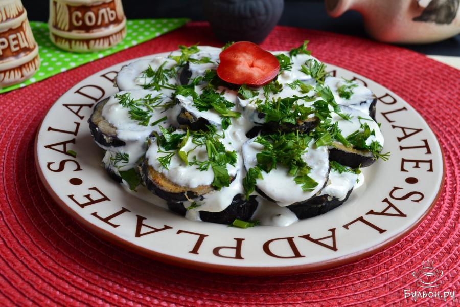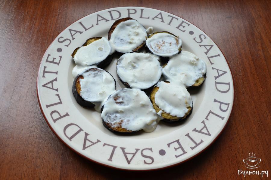 5. Далее, баклажаны выкладывать на плоскую тарелку слоями, поливая каждый из слоев сметанным соусом.