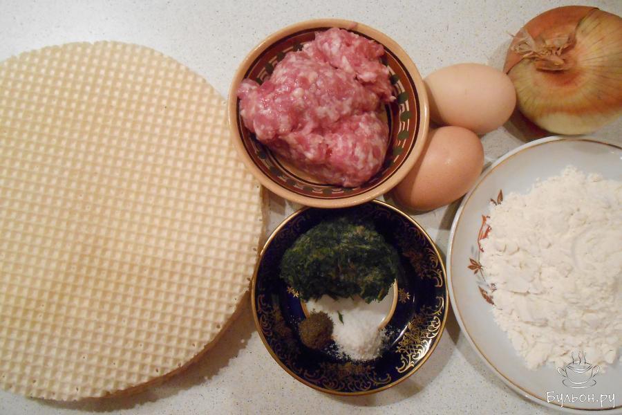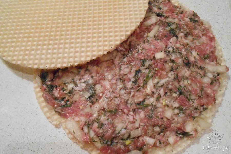 3. На одну круглую вафлю намазать половину мясной начинки. Накрыть второй вафлей и перевернуть. Дать пропитаться 5 минут, чтобы легче было нарезать.
