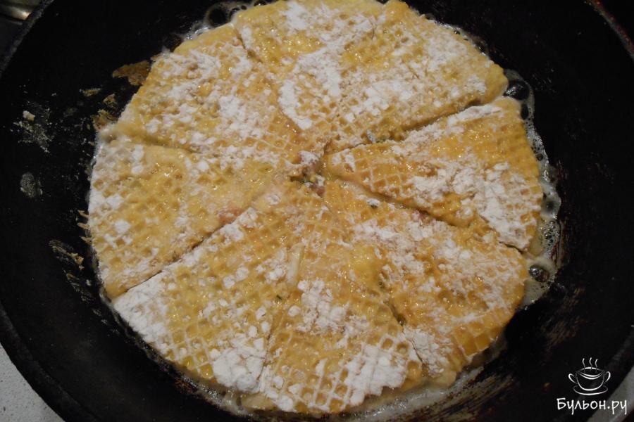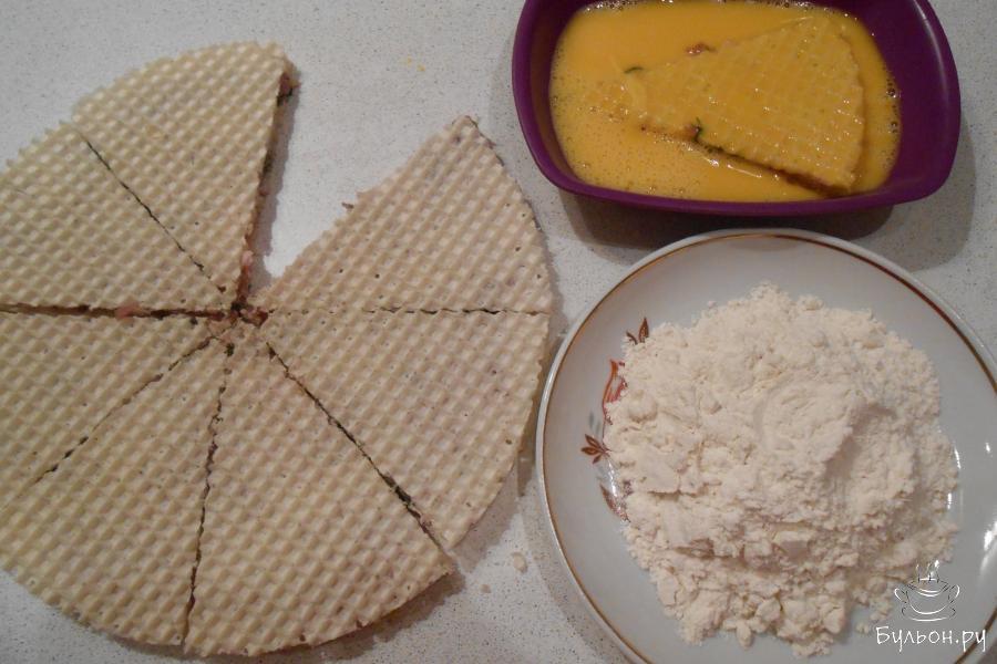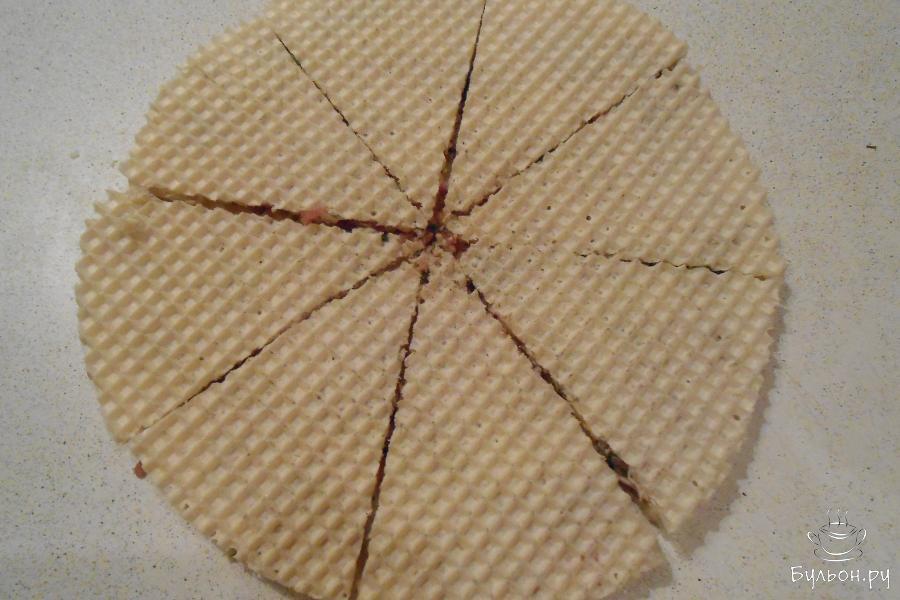 4. Разрезать пропитавшиеся вафли острым ножом на 8 сегментов. Тоже самое проделать с двумя оставшимися вафлями и второй половиной начинки.