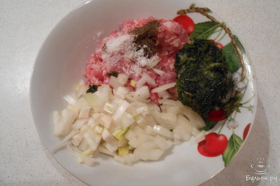 2. Лук и укроп мелко порезать. В миске соединить фарш, лук, укроп, соль и молотый кориандр. Хорошо перемешать до однородной массы. Добавить 1 столовую ложку воды и снова перемешать.