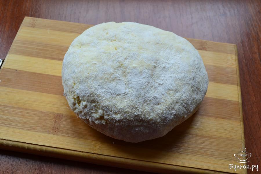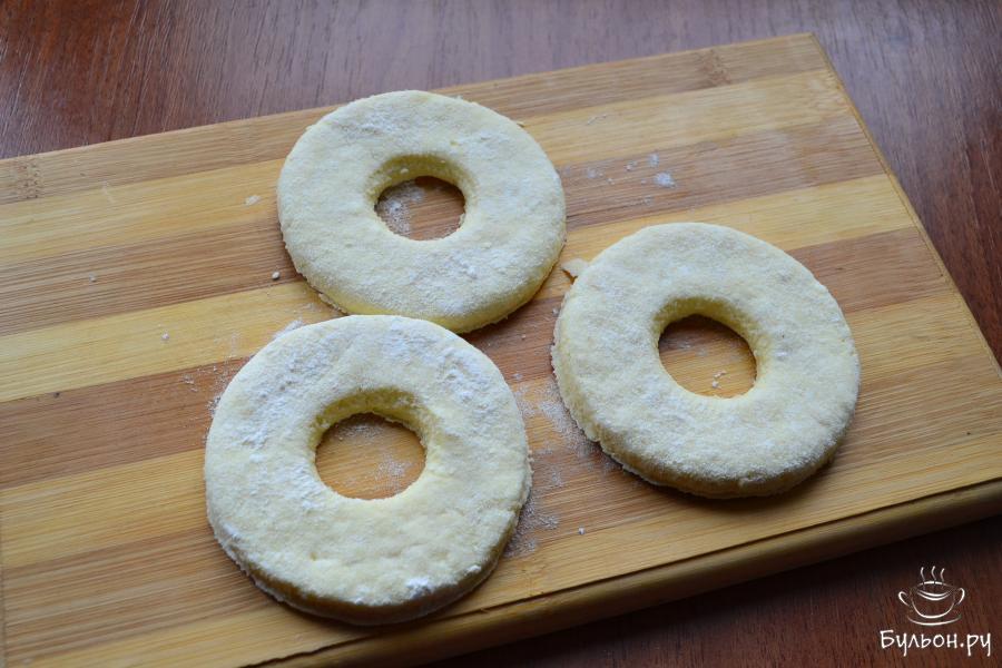 7. Подсыпая на поверхность немного муки, скалкой раскатать подготовленное тесто в пласт, толщина которого должна быть не менее 1 см. Стаканом или кружкой вырезать кружки. Емкостью меньшего диаметра посередине лепешек вырезать меньшие кружочки.