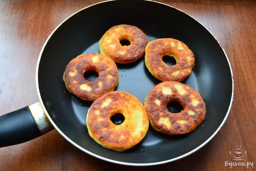 8. На небольшом огне жарить творожные пончики на сковороде с разогретым предварительно маслом, пока не зарумянятся.