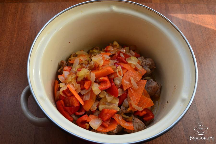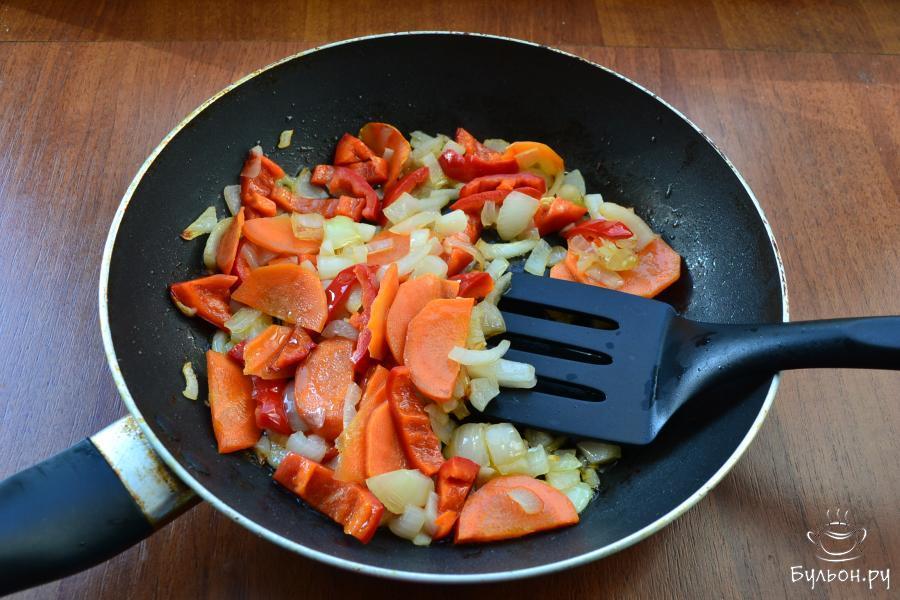 3. А в сковородку вылить оставшееся масло, поместить в него порезанный кусочками лук, полукружками порезанную морковь, а также, порезанный соломкой - болгарский перец.