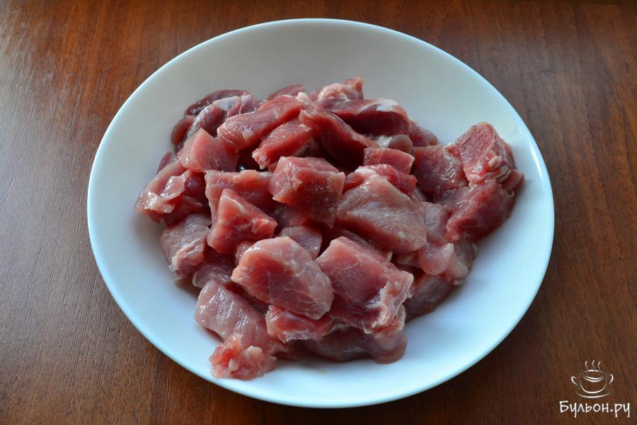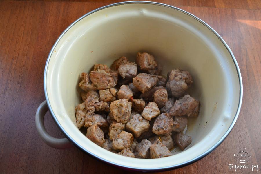 2. Смешать мясо с приправой, а далее обжарить свинину на максимальном огне до легкой румяности со всех сторон, влив в сковороду несколько столовых ложек масла. Переложить свинину в кастрюлю.