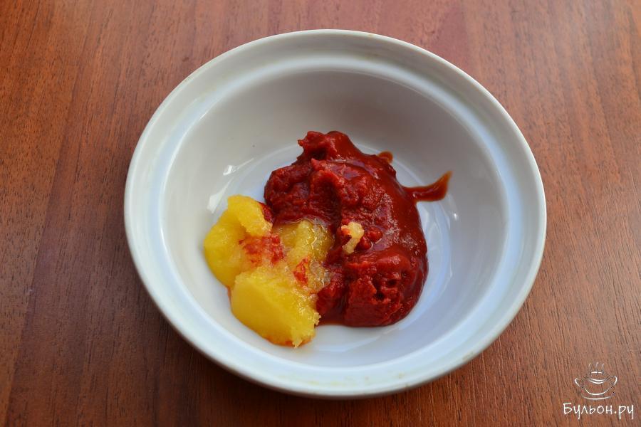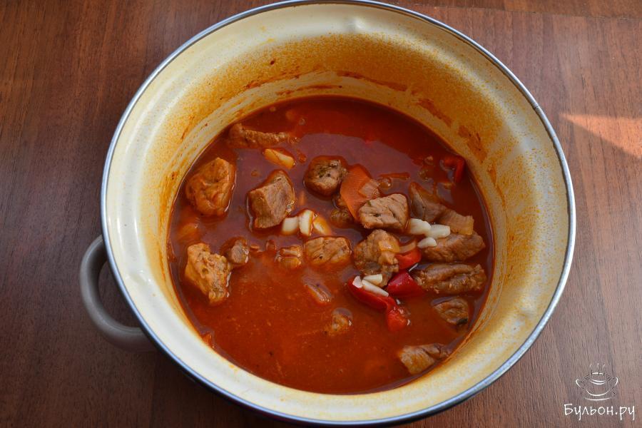 7. Добавить соус в кастрюлю вместе с солью, мелко молотой паприкой, перцем черным и молотым чили. Оставшуюся воду подогреть и влить ее в мясо.