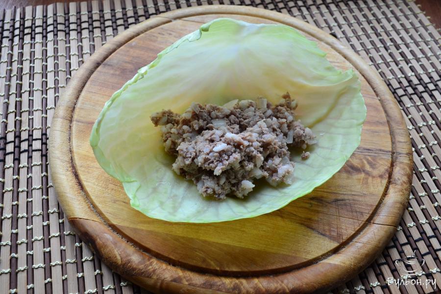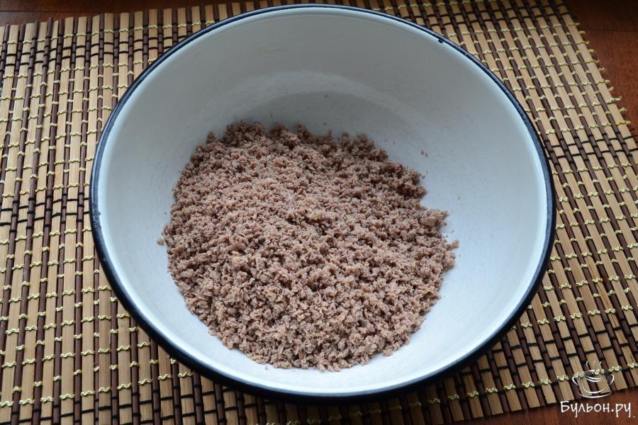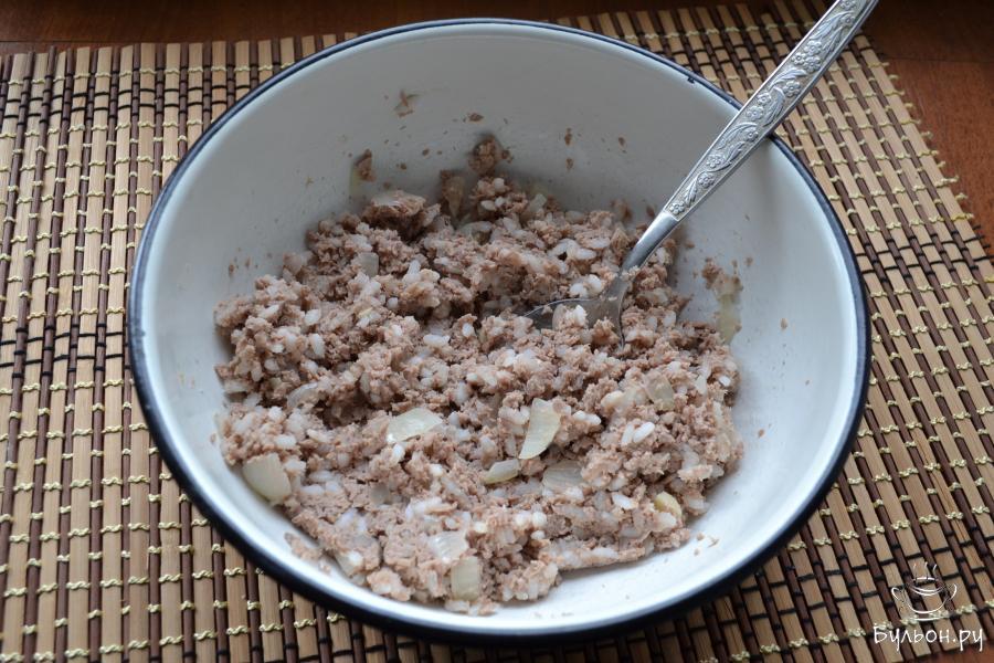 5. Рис отварить до полной готовности, залив его водой 1:6, откинуть и остудить. Добавить рис к перекрученной говядине вместе с припущенным луком.