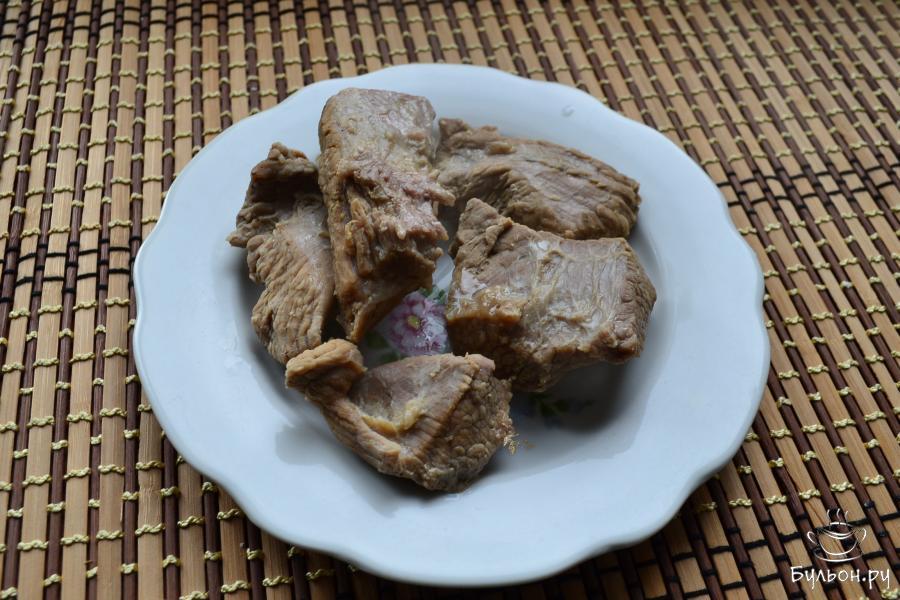 1. Постную говядину порезать небольшими кусочками, отварить до готовности в слегка подсоленной воде. Для этого понадобится около 1 часа времени. Мясо остудить.