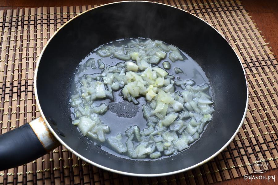 3. Половину луковицы мелко порезать, выложить в разогретую сковороду, добавить небольшой кусочек сливочного масла.
