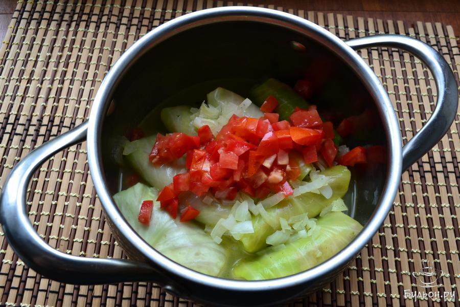 11. Выложить лук сверху голубцов. Сюда же, выложить и порезанный небольшими кубиками свежий помидор. Томатная паста и маринованные томаты при диете 5 запрещены. Вместо свежего помидора можно еще использовать помидоры в собственном соку.