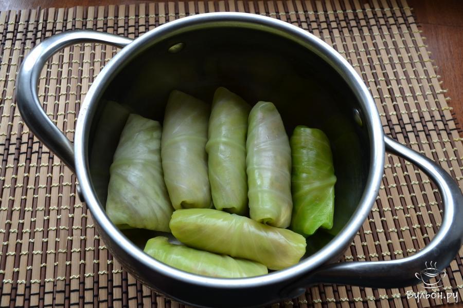 10. Голубцы поместить в кастрюльку, укладывая их боком. Вторую половину луковицы также, мелко порезать и припустить на сковороде с небольшим количеством сливочного масла и воды.