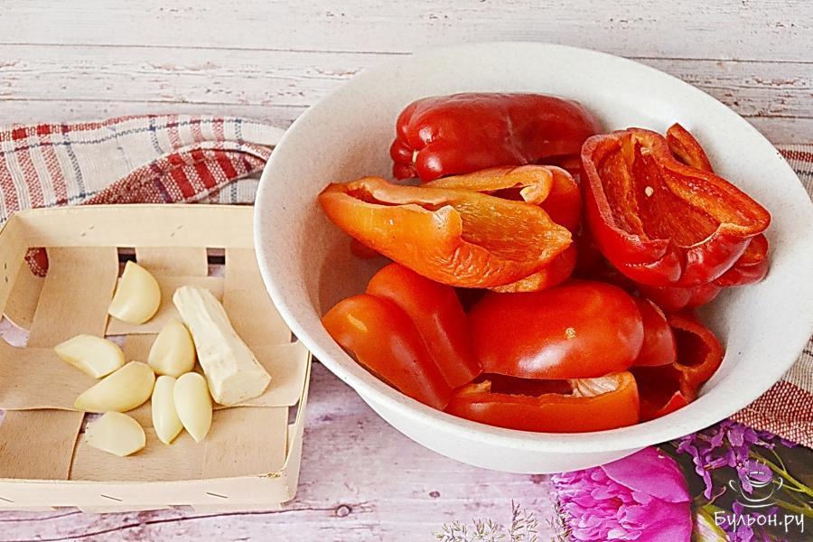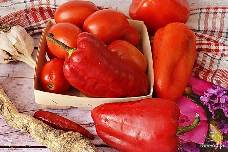 1. А понадобятся нам такие ингредиенты: красный болгарский перец, чеснок, помидоры, перец чили, соль и хрен.