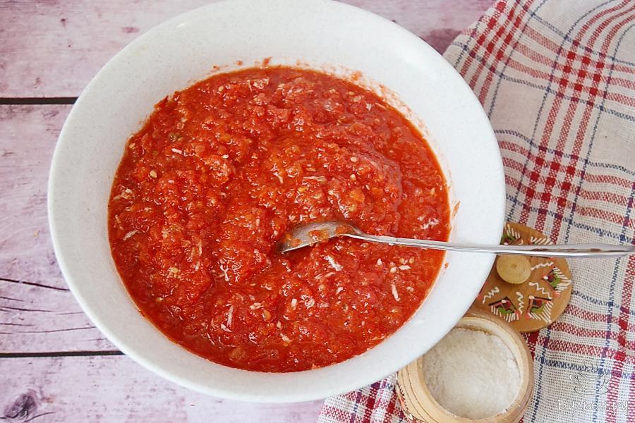3. Пропустить перец через мясорубку вместе с перчиком чили. Весь чили можно не добавлять, если не хотите получить слишком острый соус.
