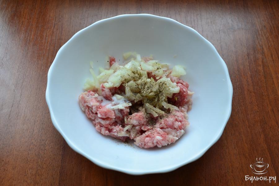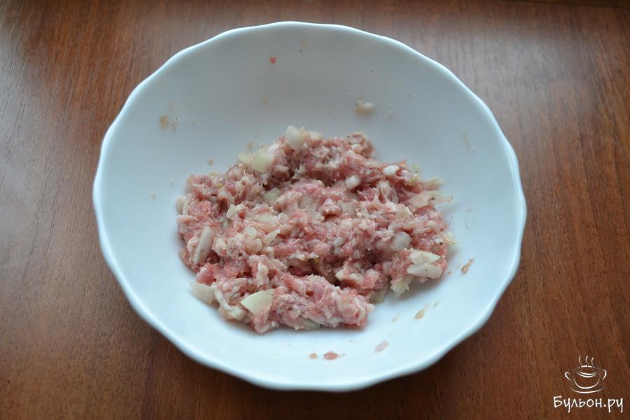 8. Пока суп варится-томится, приготовить фарш. К свиному фаршу добавить соль, мелко порезанную, небольшую луковицу и перец.