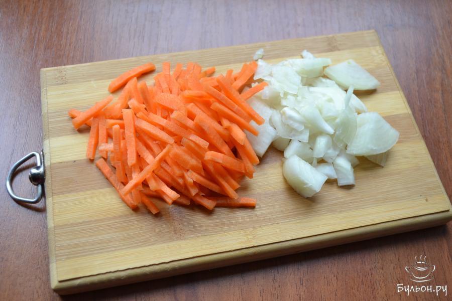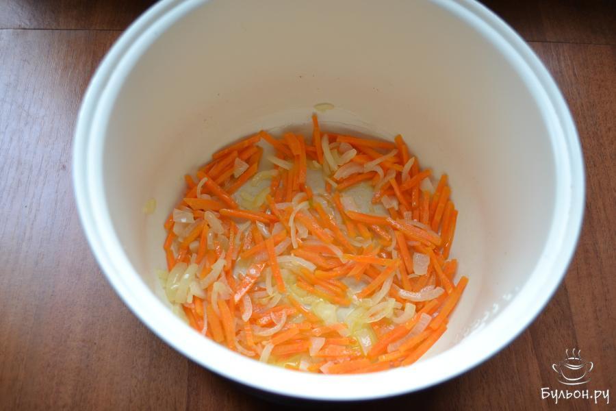 4. В большую емкость мультиварки влить масло, высыпать репчатый лук с тертой морковкой. Включить мультиварку на программу "жарка" на 10 мин. Помешивая, обжарить овощи до сигнала.