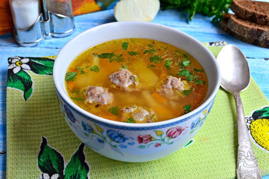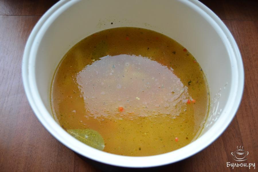 11. Через 55 минут от начала готовки супа, добавить в него фрикадельки, аккуратно перемешать и готовить далее до сигнала.
