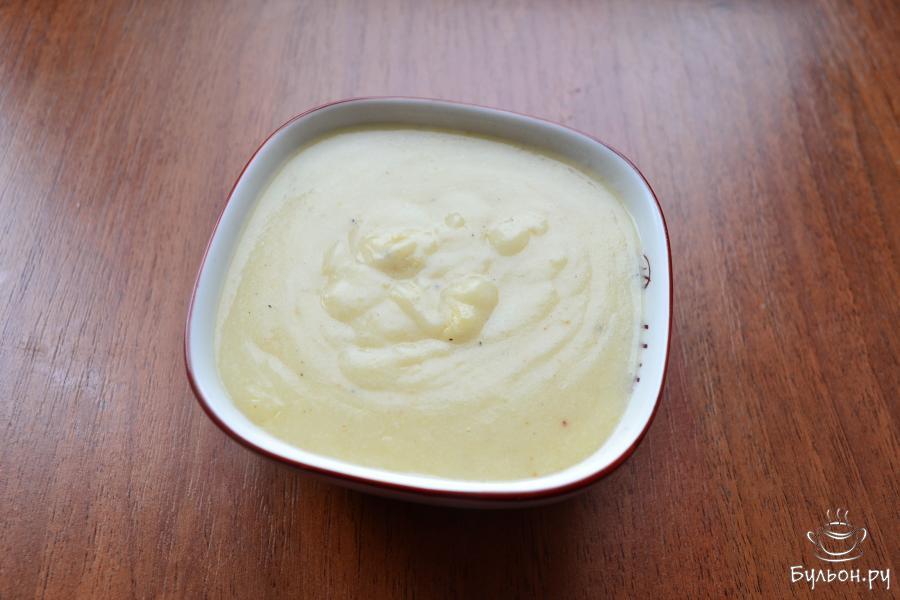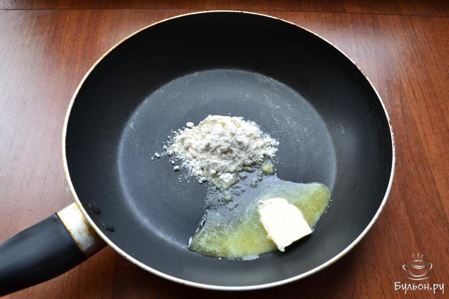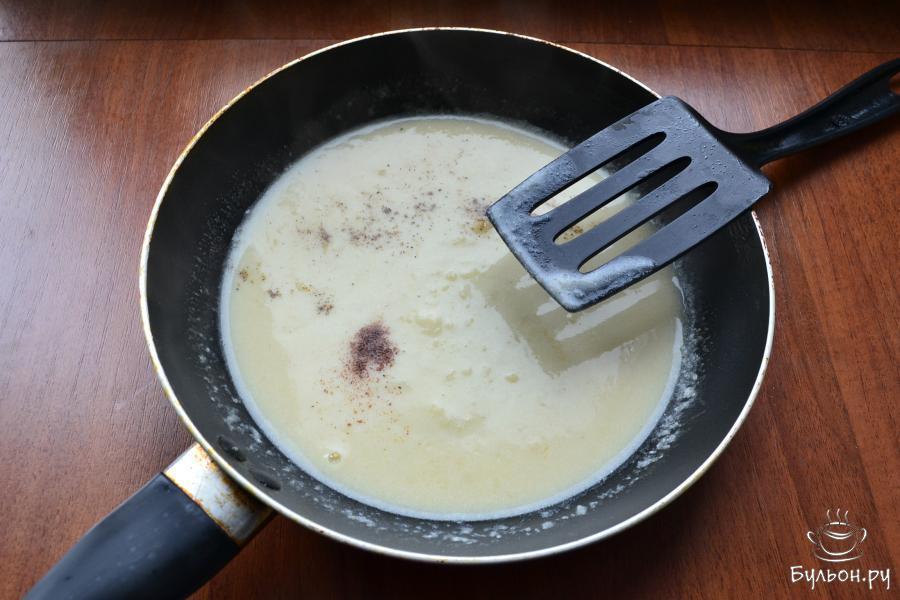 14. Затем, частями, интенсивно все перемешивая, влить молочно-сметанную смесь. Соус должен получиться без комочков. Добавить в соус мускатный орех и немного соли, перемешать, прогреть до загустения.