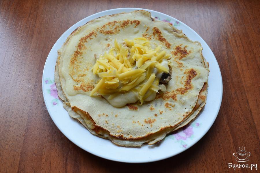 17. Далее, на середину каждого блинчика выкладывать по 1-2 ст. Ложке начинки из грибов и курицы, сверху полить соусом бешамель и посыпать все натертым твердым сыром.