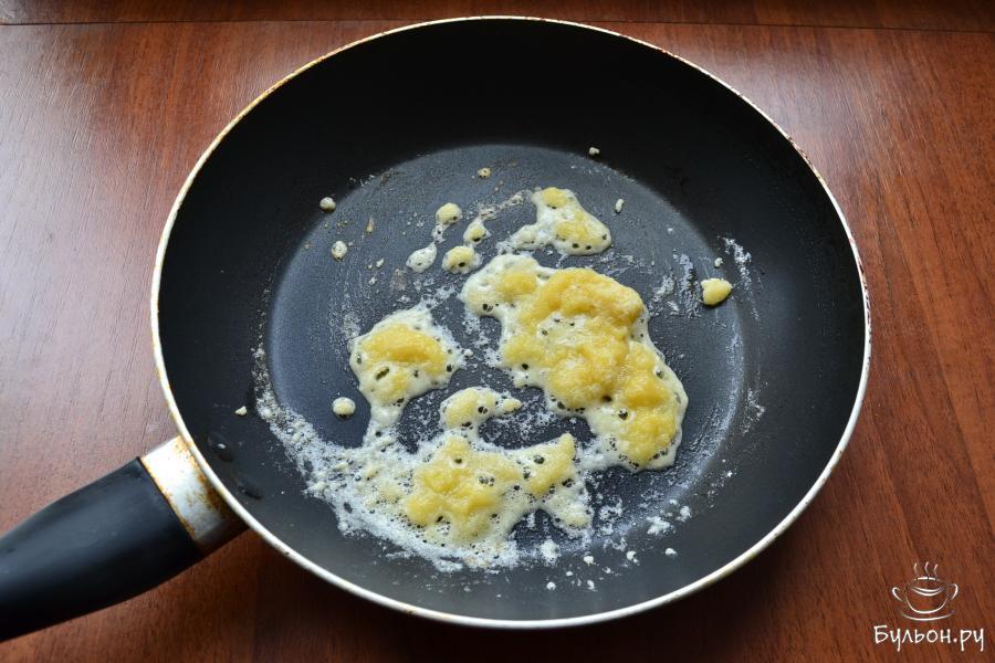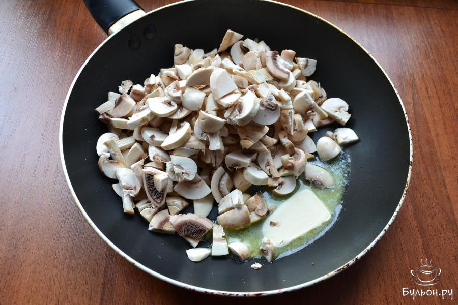 8. Для начинки: на сковороде разогреть 1 ст. Ложку сливочного и 40 г растительного масла. Добавить в сковороду порезанные свежие шампиньоны, сбрызнутые лимонным соком.