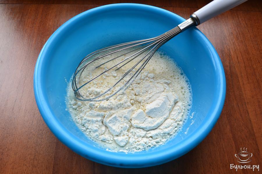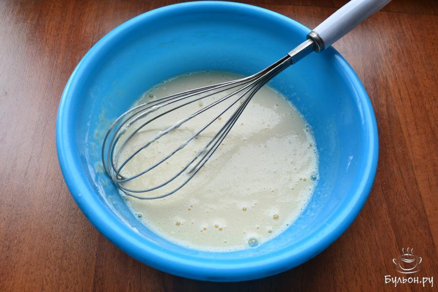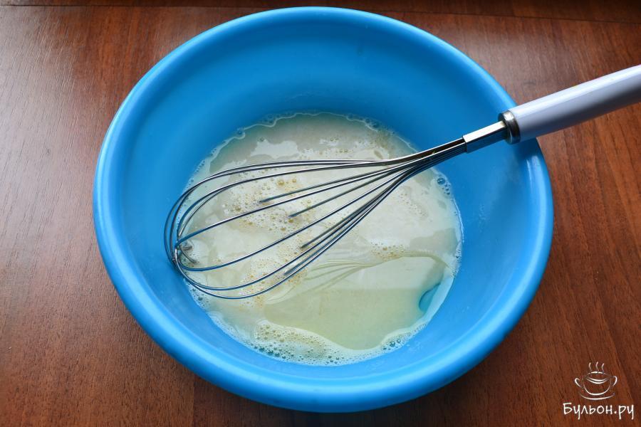 4. Венчиком хорошо яйцо расколотить, влить 0,5 стакана молока, 10 г масла растительного, все взбить немного.