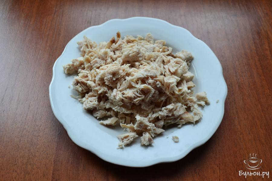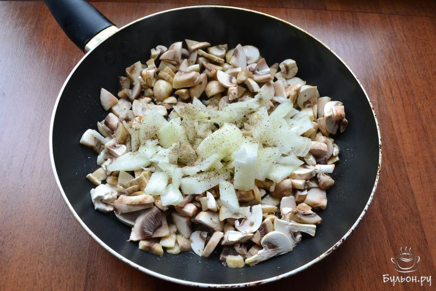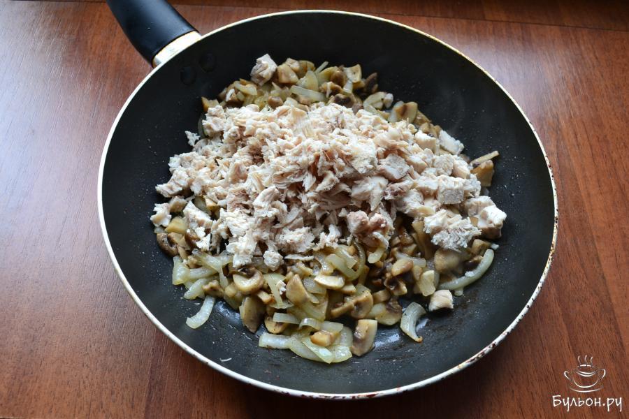 10. Обжарить грибы с репчатым луком, помешивая, в течение 7-10 минут, после чего добавить куриное филе, перемешать. Прогреть все на маленьком огне минуты 3-4. Начинка готова.