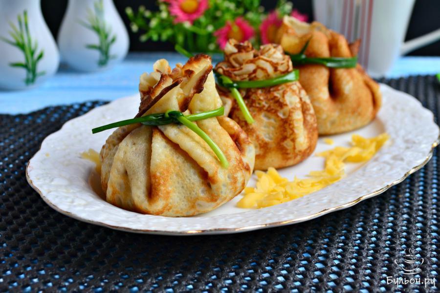 Жюльен - это известное французское блюдо, даже скорее не блюдо, а теплая закуска, которая готовится на основе нежнейшего сливочного соуса бешамель. А пробовали вы совместить русскую и французскую кухни. Вот как раз русские блинчики с начинкой французской закуски жюльена - это изобретение наших хозяек. Блинчики получаются изысканными, очень нежными и необычайно вкусными. Такие блины в форме мешочков с грибной начинкой украсят и ваш семейный, и праздничный стол. Обязательно попробуйте - это очень вкусно и сытно.