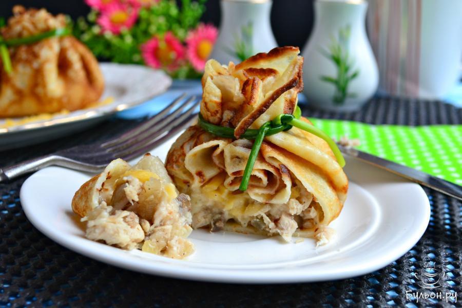 19. Блинчики с жюльеном нужно подавать к столу в теплом виде, поэтому, если они остынут, подогреть блины в микроволновке. Приятного аппетита.