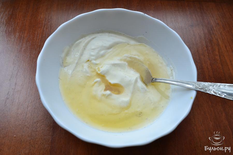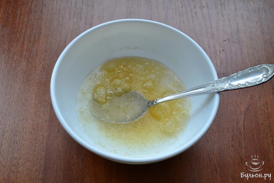 3. Желатин нагреть на газу до растворения, до кипения не доводить. Вылить желатин в сметанно-майонезный соус, быстро перемешать. Далее держать соус в тепле, лучше на водяной бане с теплой водой.
