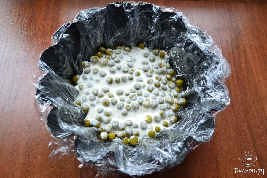 6. Следующим слоем выложить картофель, смешанный с частью соуса, сверху разместить консервированный горошек, также, смешанный с небольшим количеством желатинового соуса. Отправить все в морозильник на 5-10 минут.