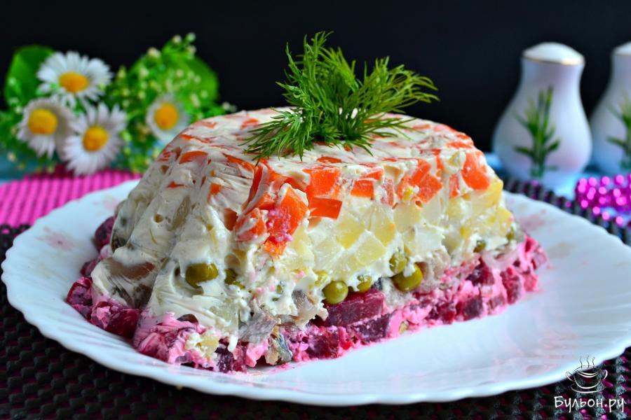 Салат "Шуба в желе" - это вариация всем известной и любимой селедки "под шубой". Этот салат по вкусу очень похож, но получается он наряднее и интереснее. Такой салат украсит любой праздничный стол, особенно уместен он будет на новогоднем столе. В данном рецепте я использовала соленую скумбрию, конечно же, можете заменить ее на селедку. Также, я добавила консервированный горошек. Ингредиенты для салата нарезаются небольшими кубиками, чтобы в разрезе получился интересный вид. Попробуйте, салат "Шуба в желе" вам обязательно понравится.