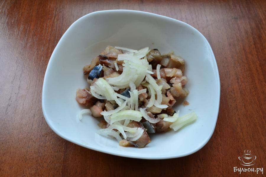 4. Свеклу, картофель, морковь предварительно отварить, остудить и очистить. Нарезать овощи небольшими кубиками, разместив их по разным тарелкам. Филе соленой скумбрии порезать кусочками, смешать с порезанным репчатым луком.