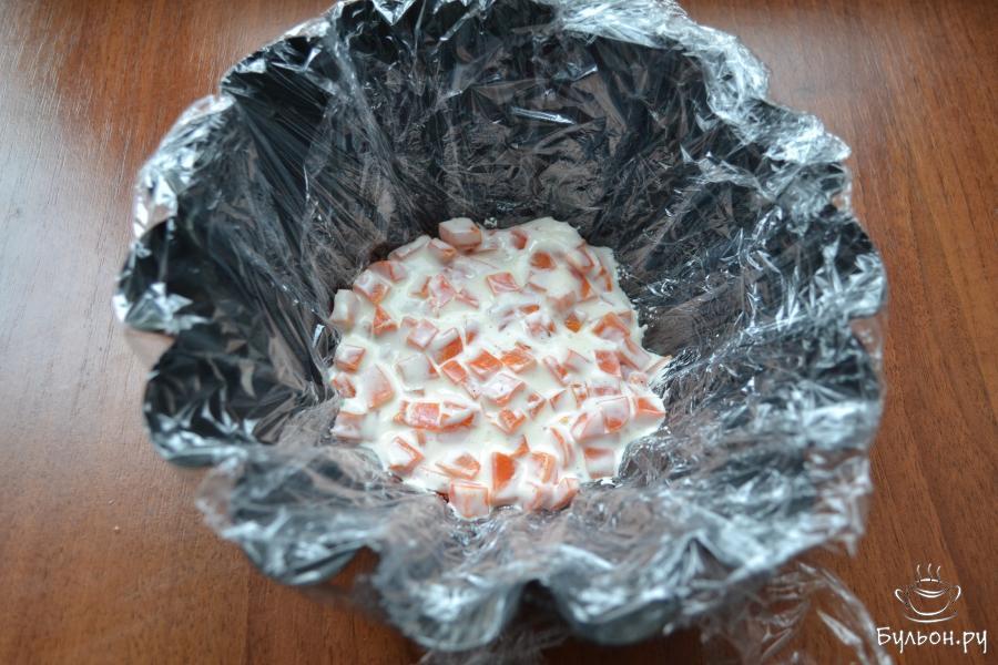 5. Любую небольшую, глубокую форму застелить пищевой пленкой в два слоя. Далее морковь смешать с частью соуса и выложить ее первым слоем. Поместить в морозильник минут на 10.