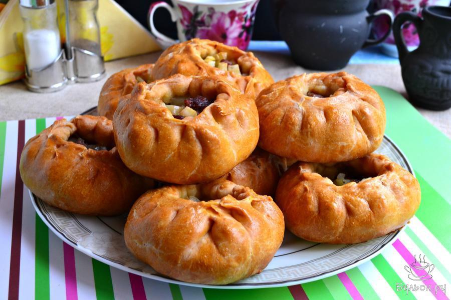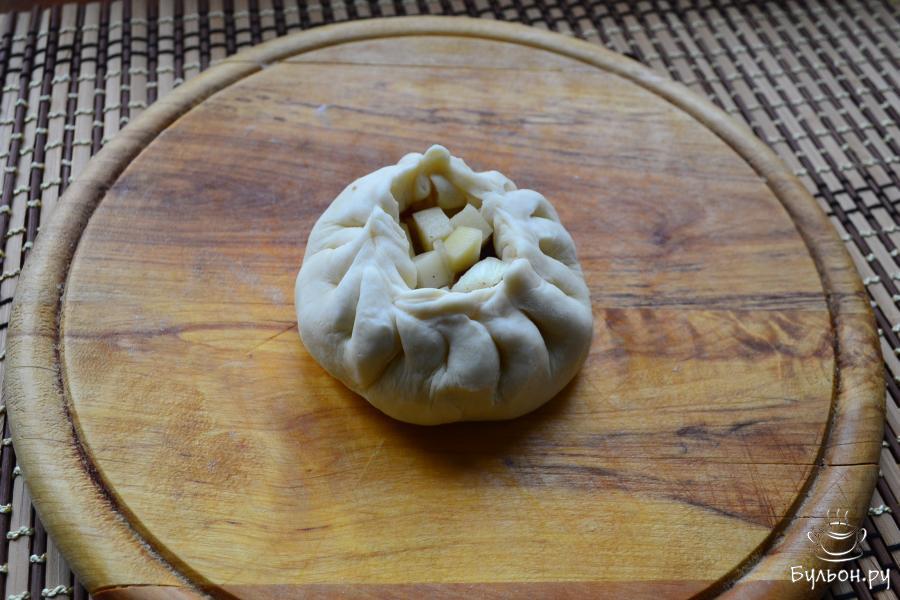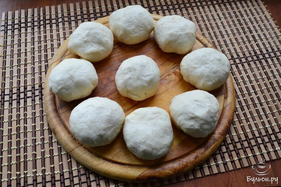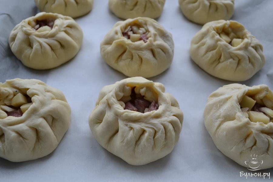 10. Каждый шарик раскатать в лепешку, диаметром с блюдце. В середину выкладывать по 1,5 ст. Ложки начинки.