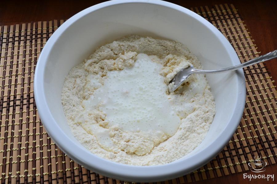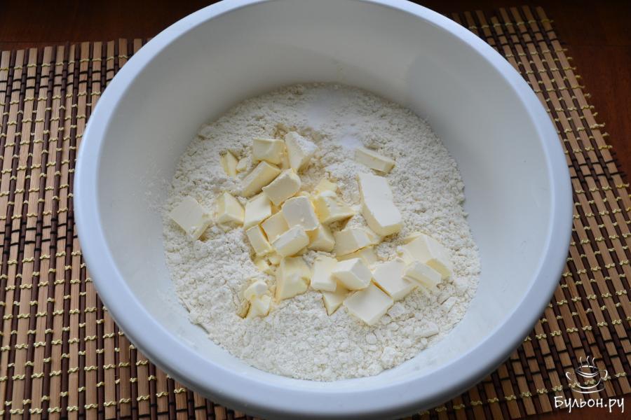 3. К муке добавить 75 г порезанного кусочками холодного масла сливочного или хорошего качества маргарина.