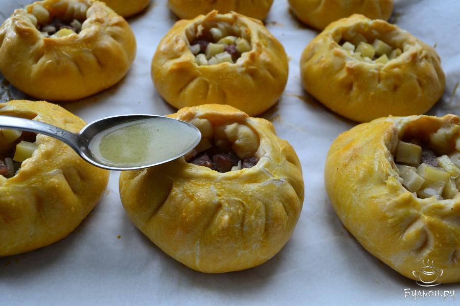 16. Вак бэлиш достать из духовки и в каждый пирожок влить по 2-3 ч. Ложки бульона. Поместить пирожки в духовку еще на 15 минут.