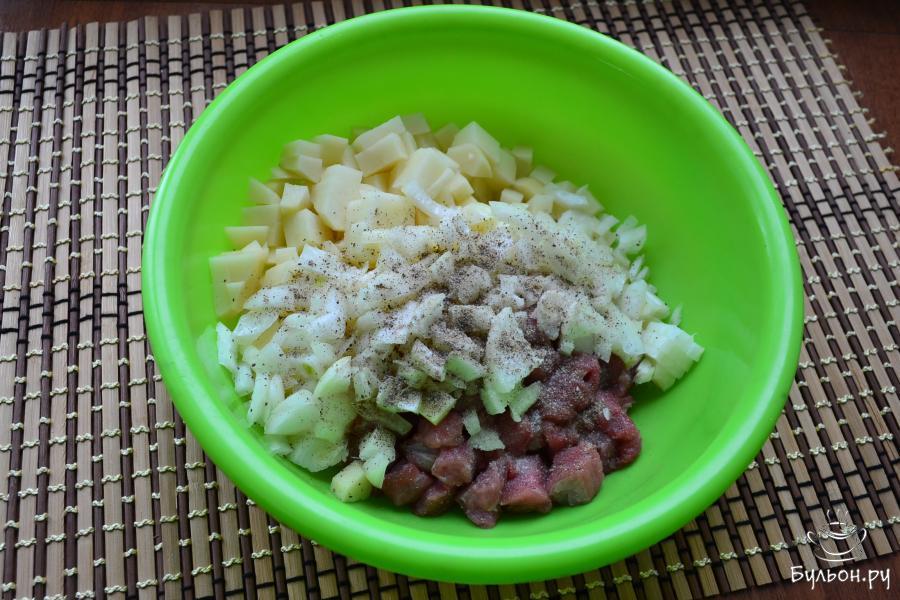 7. К картофелю с мясом добавить порезанный кубиками репчатый лук, всыпать 1/2 ч. Ложки соли и черный перец.