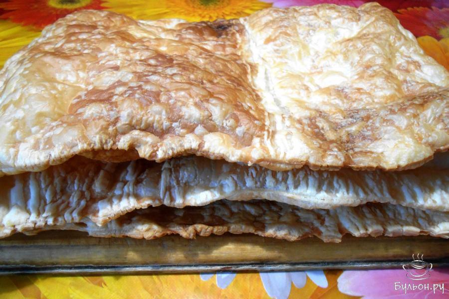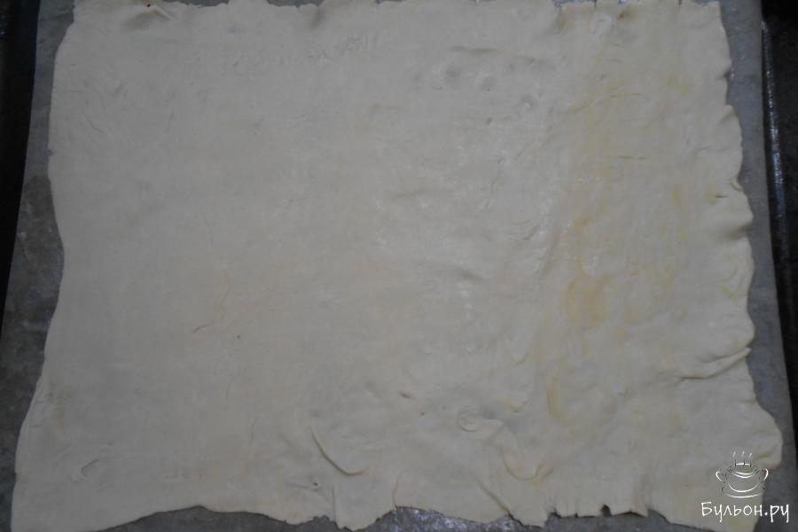 4. Аккуратно переносим раскатанное слоеное тесто на противень, застеленный пергаментом. Ставим в разогретую до 180 градусов духовку на 10 минут.