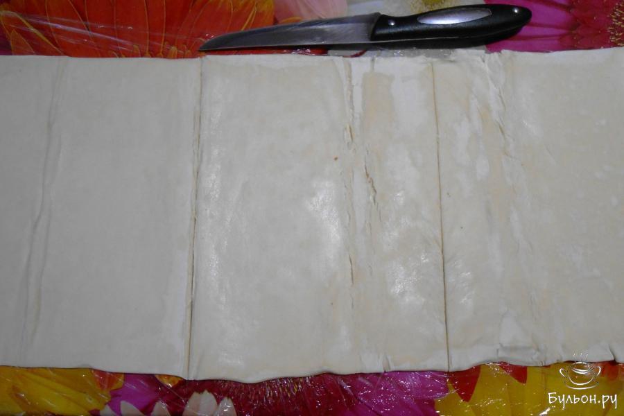 3. Первый прямоугольник оборачиваем пищевой пленкой. С помощью скалки немного раскатываем слоеное тесто.